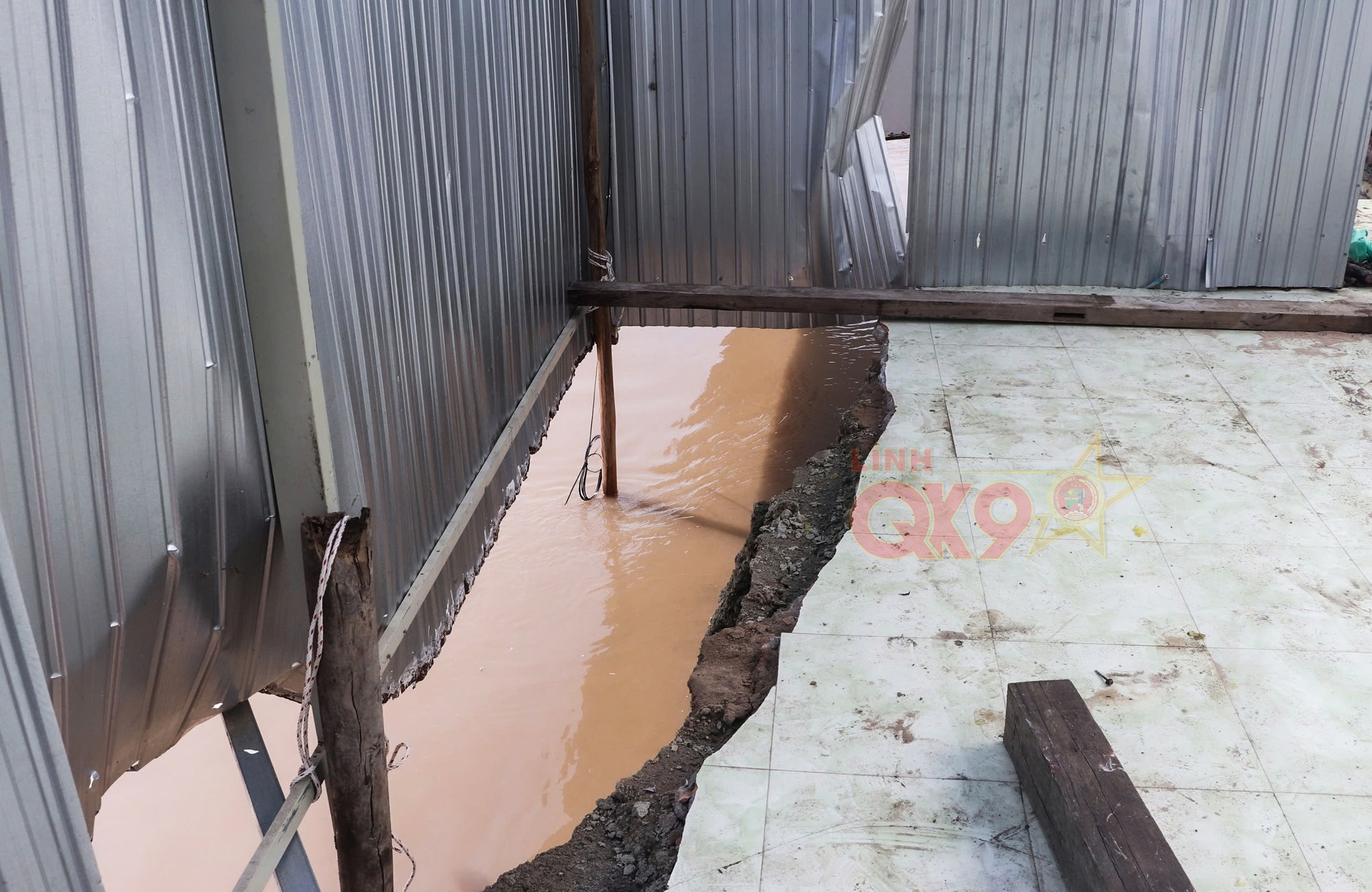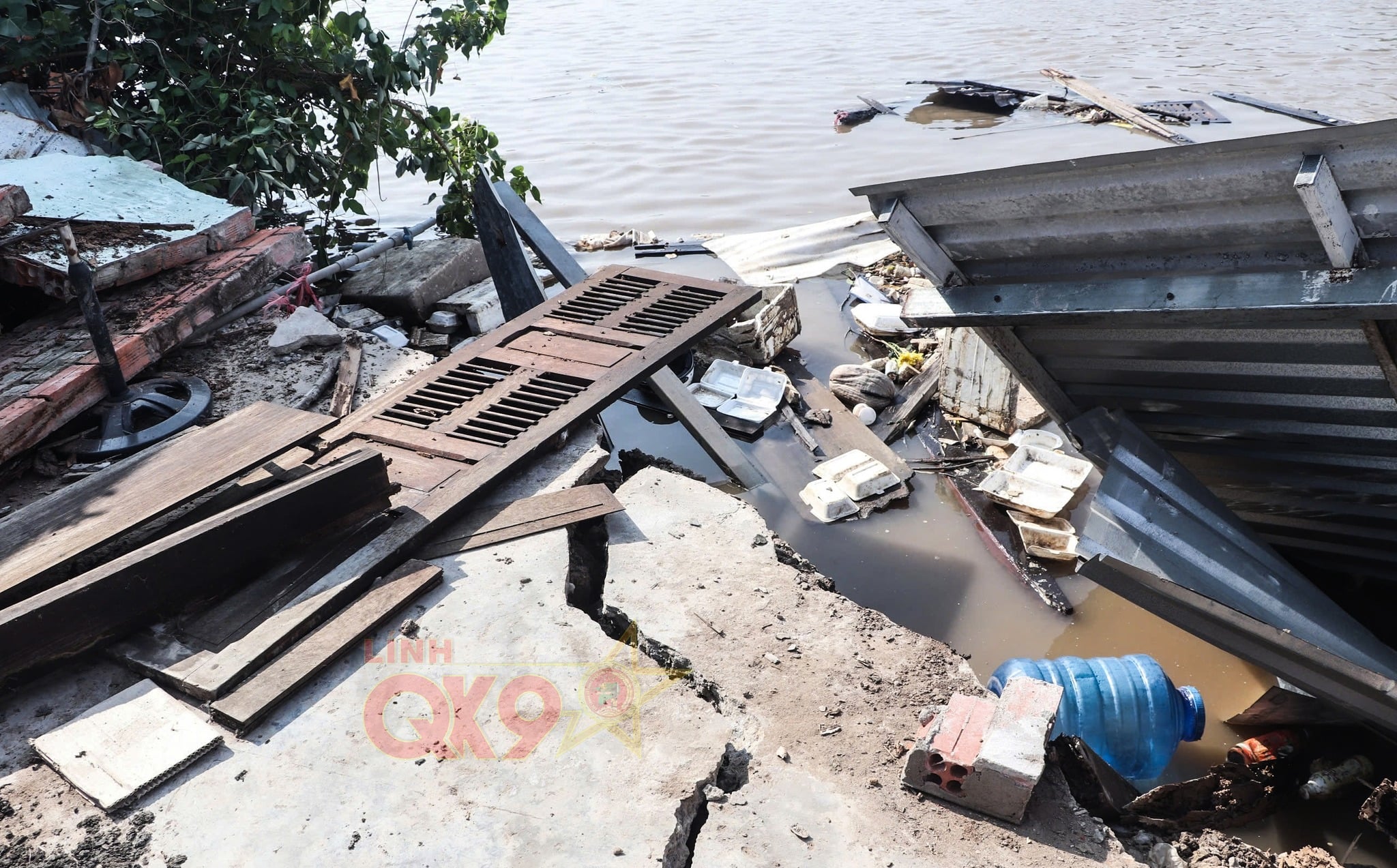 Nền nhà, mái nhà bị bẻ vụn, sập xuống kênh. (Ảnh: Lính Quân Khu 9/Facebook)