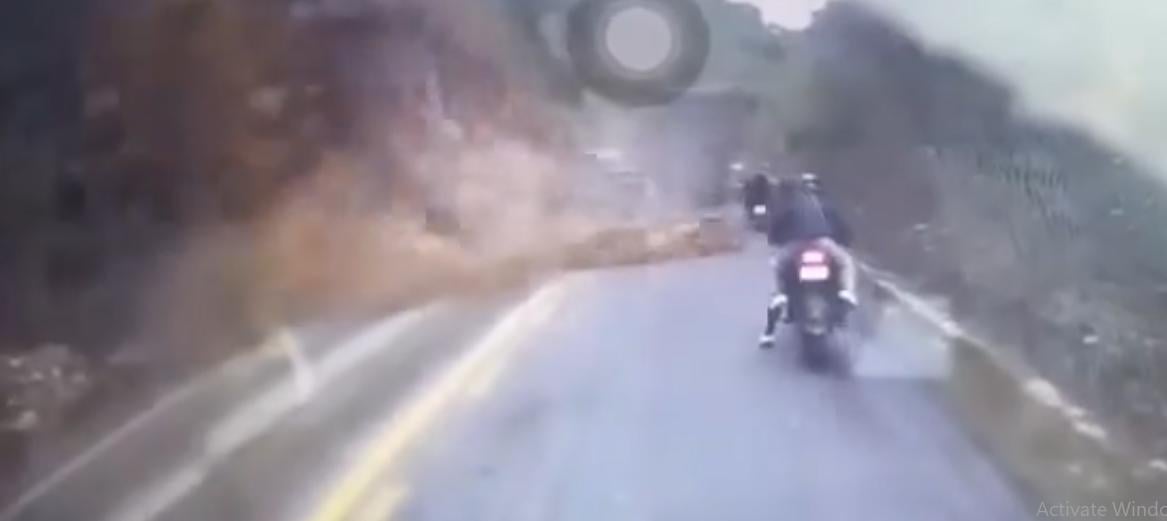 Hình ảnh từ camera hành trình của một ô tô cho thấy các phương tiện đang lưu thông bình thường qua khu vực thì vách núi sạt lở mạnh chỉ trong tích tắc.
