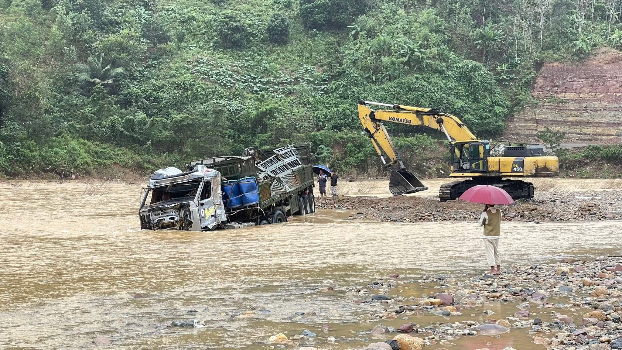 Chiếc xe đầu kéo và thùng container bị lũ cuốn ở đập tràn A Rông Trên (tỉnh Quảng Trị) đã được kéo vào bờ, sau hơn một ngày gặp nạn. Đầu và thân xe biến dạng nặng do lũ siết, va đập vào đá ở lòng sông.