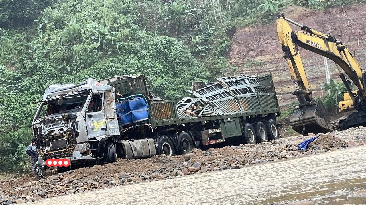 Tài xế xe đầu kéo không lách rào chắn, chiếc xe bị lũ siết biến dạng