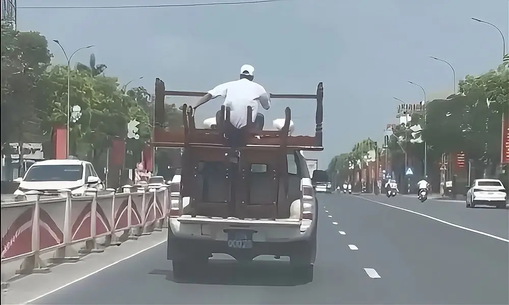 Theo video do người dân ghi lại, vào khoảng 10h37 ngày 22/3, chiếc xe bán tải mang biển xanh 75M-000.xx chở nhiều bàn, ghế xếp chồng lên nhau ở thùng xe, lưu thông trên Quốc lộ 1, đoạn qua phường Hương Trà. Một người đàn ông ngồi trên các chồng bàn ghế ở thùng xe, hai tay giữ số bàn ghế.