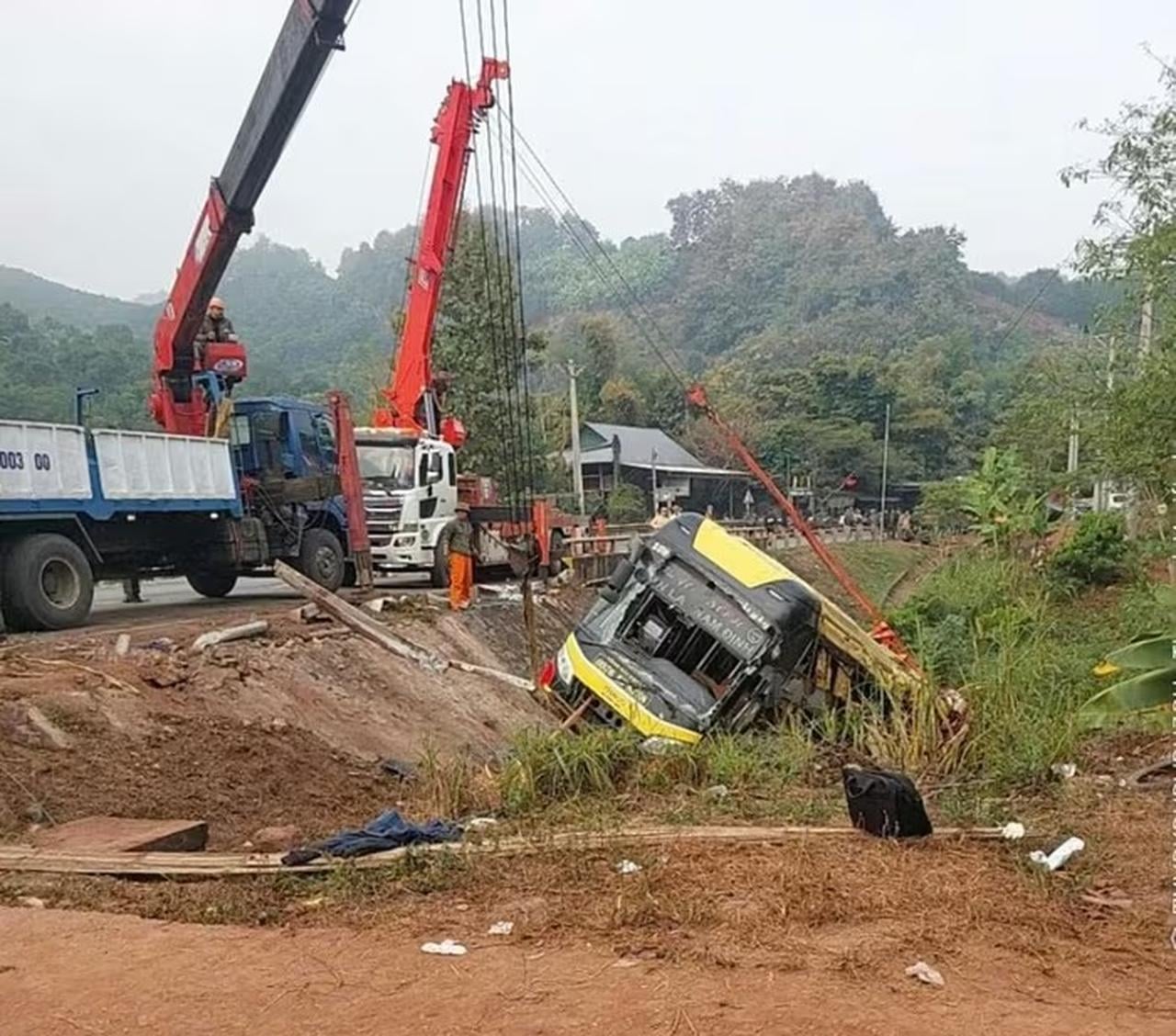 Theo đó, xe khách bị kẹt phanh, lao sang bên trái, sau đó tài xế đánh lái sang phải, đâm vào biển báo và hộ lan tôn sóng đầu cầu. Cú va chạm mạnh khiến xe lật xuống kè ốp mái đầu cầu, rơi xuống mương nước ven đường.