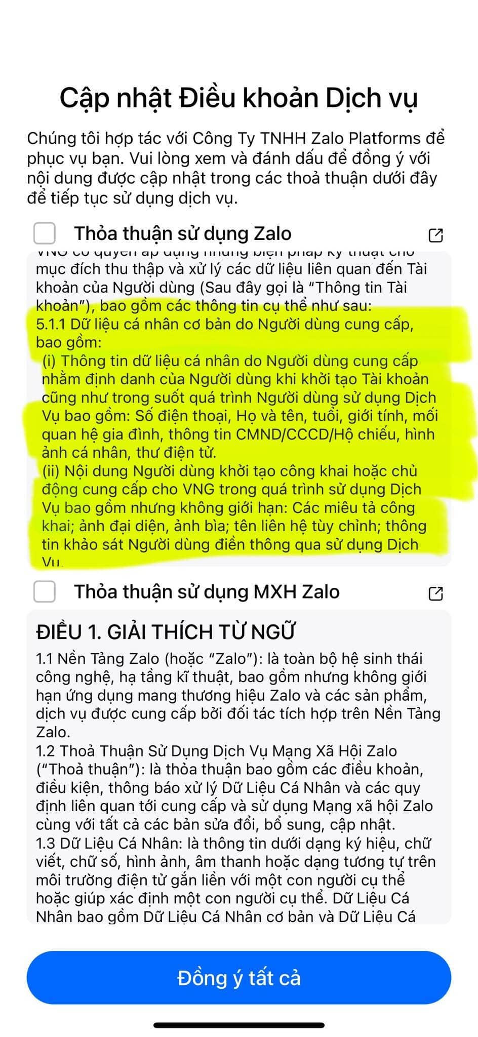 Những ngày gần đây, Zalo đồng loạt hiển thị thông báo yêu cầu người dùng đánh dấu đồng ý với các điều khoản mới để tiếp tục sử dụng ứng dụng. Nếu không chấp thuận, người dùng sẽ không truy cập được các chức năng cơ bản như nhắn tin và gọi điện. Một số nguồn cho biết nếu không chấp nhận, tài khoản có thể bị xóa sau 45 ngày.
