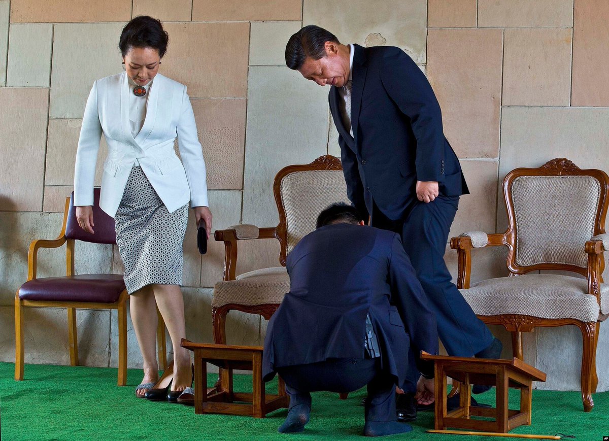 Từ biểu cảm trên gương mặt ông Tập có thể thấy ông đã quá quen với cảnh tượng này. Người nhân viên cúi dưới chân ông, nhìn phần hói phía sau đầu cho thấy tuổi tác cũng không còn trẻ. Hành động mang tính phục dịch như vậy dường như không khiến ông Tập cảm thấy chút bất an nào. Nhìn lại bức ảnh năm 2014, có thể suy đoán rằng kể từ khi ông Tập lên nắm quyền, những cảnh tượng tương tự đã không biết xảy ra bao nhiêu lần. Vợ chồng ông dường như đã quá quen với đặc quyền này.