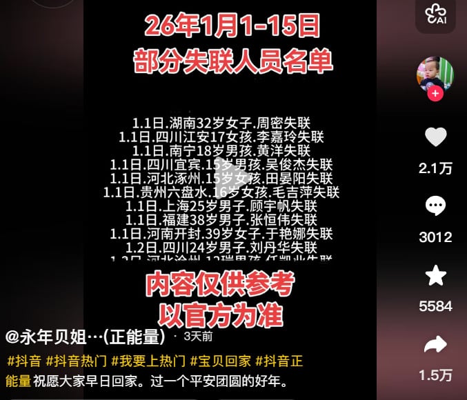 Ngày 31/1, một blogger Douyin ở Đại Lục với tên “Vĩnh Niên Bối Tỷ… (Năng lượng tích cực)” đã đăng tải danh sách thống kê người mất tích. Từ ngày 1/1 – 15/1, có 78 người mất tích, người nhỏ tuổi nhất mới 7 tuổi, người lớn tuổi nhất 56 tuổi, phần lớn là thanh thiếu niên.