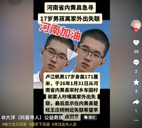 Ngày 2/2, trên nền tảng Douyin Đại Lục xuất hiện nhiều thông báo tìm người: Ngày 31/1, cậu bé 17 tuổi Lư Giang Phàm ở huyện Hoàng, thành phố An Dương, tỉnh Hà Nam mất tích; ngày 29/1, Lý Tử Lâm, 19 tuổi, ở huyện Xã Kỳ, thành phố Nam Dương, tỉnh Hà Nam mất tích.