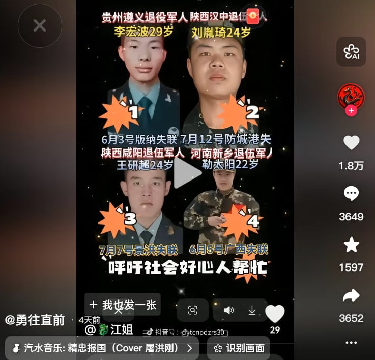 Ngày 30/1, một blogger Douyin có tên “Dũng cảm tiến lên” đăng tải hình ảnh cho biết nhiều cựu quân nhân đã mất tích: Cựu quân nhân 22 tuổi Lặc Thái Dương ở Tân Hương, Hà Nam mất tích từ ngày 5/6/2025; cựu quân nhân 24 tuổi Lưu Dận Kỳ ở Hán Trung, Thiểm Tây mất tích từ ngày 12/7/2025.