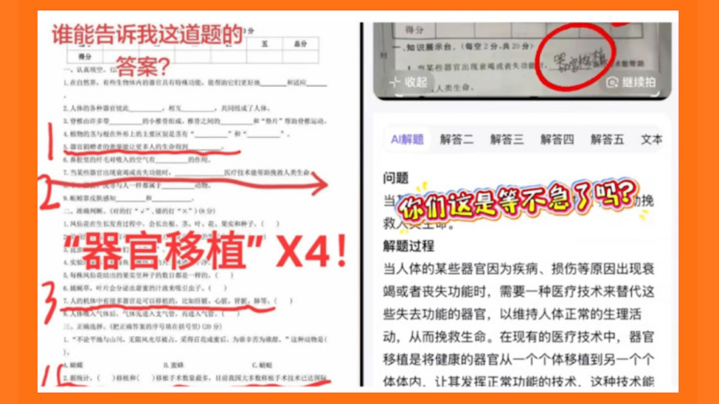 Gần đây, trong đề thi môn Khoa học lớp Ba tại Trung Quốc xuất hiện một số câu hỏi liên quan đến cấy ghép nội tạng. Sau khi ảnh chụp đề thi này lan truyền trên mạng, nhiều phụ huynh bày tỏ sự lo ngại, thậm chí rợn tóc gáy.