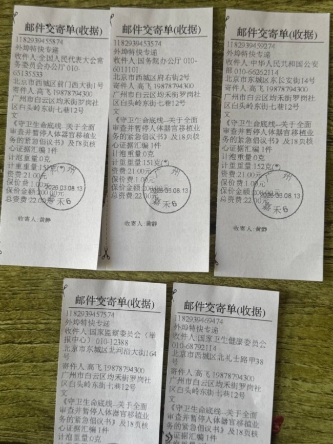 Vào ngày 8/3/2026, người khởi xướng – cư dân Quảng Châu Cao Phi, đã gửi “Thư kiến nghị khẩn cấp” đến 5 cơ quan gồm: Văn phòng Ủy ban Thường vụ Đại hội Đại biểu Nhân dân Toàn quốc, Văn phòng Quốc vụ viện, Bộ Công an, Ủy ban Giám sát Quốc gia và Ủy ban Y tế Quốc gia Trung Quốc. Các thư này đã được ký nhận trong khoảng từ ngày 11/3–12/3.
