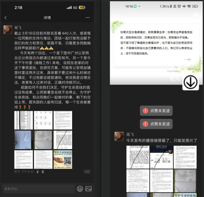 Cùng lúc, một số nội dung liên quan trên WeChat của Cao Phi bị chặn, đường dẫn trang ký tên bị ngừng truy cập, và tài khoản công chúng WeChat của ông bị khóa vĩnh viễn chỉ sau vài ngày sử dụng.