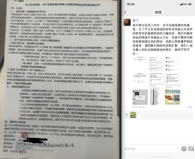 Ông Cao Phi viết trong thư: “Mỗi sinh mệnh đều thiêng liêng và là một chỉnh thể duy nhất, tuyệt đối không phải là những ‘linh kiện sinh học’ để bộ máy nhà nước hay các nhóm lợi ích có thể tháo rời và lưu thông.”