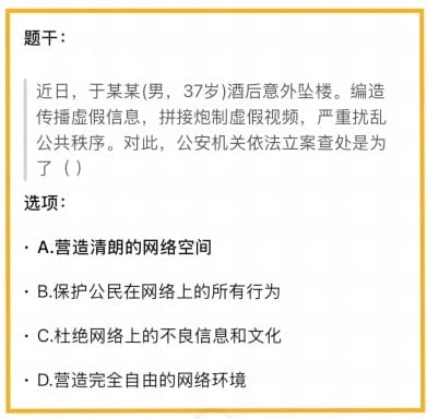 Ngày 24/11, một cư dân mạng phát hiện trong đề thi môn Đạo đức và Pháp luật tại tỉnh Phúc Kiến có câu trắc nghiệm như sau: Gần đây, một người đàn ông (37 tuổi) tử vong do tai nạn ngã từ tầng cao. Một số cá nhân lan truyền thông tin sai lệch, dựng video giả trên mạng, gây rối trật tự công cộng. Cơ quan công an xử lý theo pháp luật nhằm mục đích gì? Học sinh phải chọn trong các phương án như “tạo môi trường mạng trong lành”, “ngăn chặn thông tin và văn hóa xấu trên mạng”, v.v.