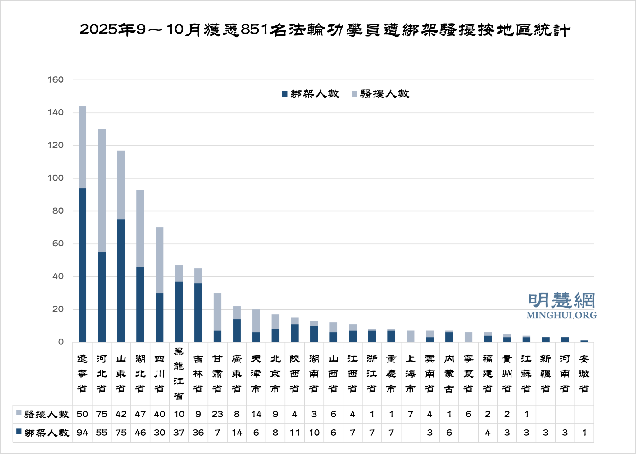Theo Minghui.org, từ tháng 9-10 đã ghi nhận ít nhất 851 học viên Pháp Luân Công bị bắt cóc và sách nhiễu, trong đó 482 người bị bắt cóc, 369 người bị sách nhiễu.