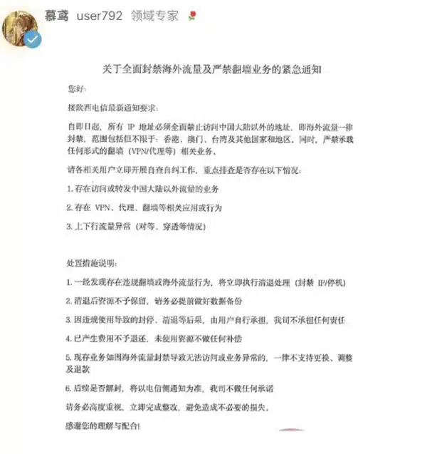 Theo yêu cầu trong thông báo, kể từ nay tất cả địa chỉ IP bị cấm truy cập vào các địa chỉ bên ngoài Trung Quốc Đại Lục, toàn bộ lưu lượng ra nước ngoài sẽ bị phong tỏa theo thông báo, phạm vi bao gồm nhưng không giới hạn ở Hồng Kông, Ma Cao, Đài Loan và các quốc gia, khu vực khác; đồng thời nghiêm cấm triển khai bất kỳ hình thức dịch vụ vượt tường lửa nào (VPN/proxy, v.v.).