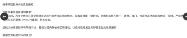 Ngoài ra còn có một “Thông báo khẩn về một số IP tại Thiểm Tây” cho biết: Qihang (Khởi Hàng) CDN sẽ gỡ bỏ toàn bộ các nút tại Thiểm Tây, thay thế bằng máy chủ vật lý tại các khu vực khác trong nước, nhằm ứng phó với các chính sách đã và sắp được ban hành.
