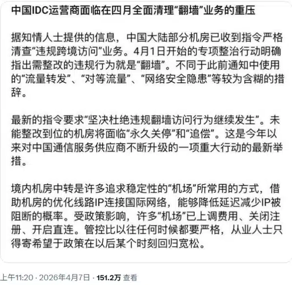 Theo nguồn tin nội bộ, một số trung tâm dữ liệu tại Trung Quốc đại lục đã nhận được chỉ thị kiểm tra nghiêm ngặt các dịch vụ “truy cập xuyên biên giới trái quy định”. Chiến dịch chỉnh đốn chuyên biệt bắt đầu từ ngày 1/4, trong đó nêu rõ hành vi vi phạm cần chấn chỉnh chính là “vượt tường lửa”, khác với các cách diễn đạt mơ hồ trước đây như “chuyển tiếp lưu lượng”, “lưu lượng đối đẳng”, “rủi ro an ninh mạng”.