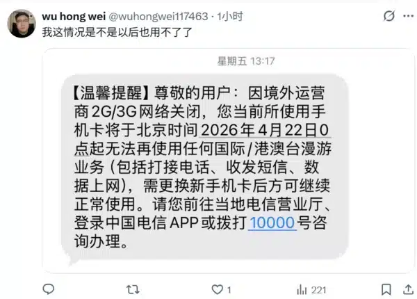 Ngày 8/4, một người dùng X tên “wu hong wei” đăng tải tin nhắn mà điện thoại của mình nhận được từ China Telecom, cho biết SIM của anh từ 0h ngày 22/4/2026 (giờ Bắc Kinh) sẽ không thể sử dụng bất kỳ dịch vụ chuyển vùng quốc tế/Hồng Kông-Ma Cao-Đài Loan nào, bao gồm gọi điện, nhận/gửi tin nhắn, dữ liệu internet; cần thay SIM mới thì mới có thể tiếp tục sử dụng bình thường.