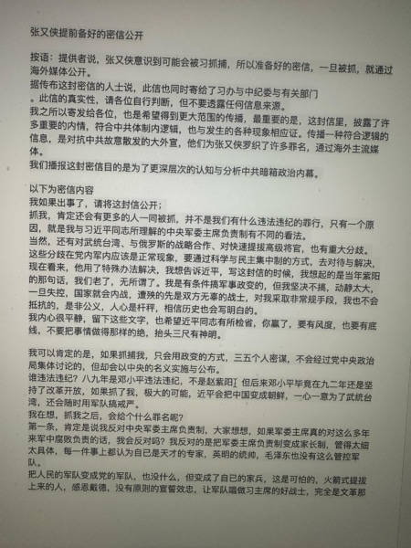“(Chú thích: Người cung cấp thông tin cho biết, ông Trương Hựu Hiệp nhận thức rõ rằng có thể sẽ bị ông Tập Cận Bình bắt, vì vậy đã chuẩn bị một bức thư mật. Nếu bị bắt, ông sẽ công khai thư này qua các phương tiện truyền thông quốc tế.)