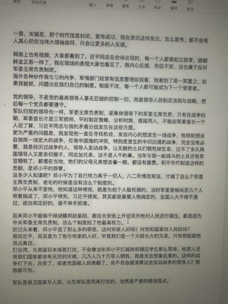 Điều đầu tiên, chắc chắn là tôi phản đối chế độ Chủ tịch Quân ủy Trung ương chịu trách nhiệm. Mọi người thử nghĩ xem, nếu Chủ tịch Quân ủy Trung ương thật sự phải chịu trách nhiệm về nạn tham nhũng trong quân đội suốt bao nhiêu năm qua, liệu tôi có phản đối không? Điều tôi phản đối là việc biến chế độ Chủ tịch Quân ủy Trung ương thành chế độ gia trưởng, quản lý quá chi tiết, quá cụ thể, và luôn cho rằng bản thân là chuyên gia tài ba, là người lãnh đạo sáng suốt. Mao Trạch Đông cũng không can thiệp vào quân đội như vậy.