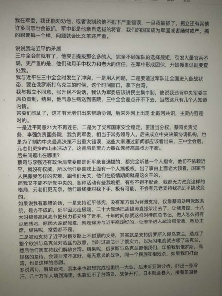 Những bất đồng này trong Đảng và quân đội là hiện tượng bình thường, cần phải được giải quyết thông qua phương thức khoa học và dân chủ tập trung, nhưng bây giờ, nhìn lại, ông ấy đã dùng những phương thức đặc biệt để giải quyết. Tôi muốn nói với Tập Cận Bình, khi viết bức thư này, tôi nhớ lại lời của Tổ trưởng Tử Dương năm đó: ‘Chúng ta già rồi, không sao cả’. Tôi có khả năng tổ chức một cuộc đảo chính quân sự, nhưng tôi kiên quyết không làm vậy, vì quá ồn ào, nếu mất kiểm soát, đất nước sẽ rơi vào nội chiến. Những người vô tội trước tiên sẽ là các chiến sĩ vô tội. Nếu họ dùng phương pháp không chính thống để đối phó với tôi, tôi cũng sẽ không kháng cự. Đúng sai là thước đo, nhân tâm là cái cân, tôi tin rằng lịch sử sẽ viết rõ điều này.