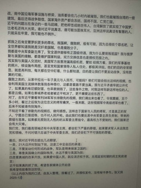 Ngày 24/1, sau khi Phó Chủ tịch Quân ủy Trung ương Trương Hựu Hiệp và thành viên Quân ủy Trung ương Lưu Chấn Lập bị chính thức thông báo điều tra, phóng viên của Epoch Times đã nhận được thông tin từ một người cung cấp, hé lộ nội dung bức thư mật mà ông Trương đã viết trước khi bị bắt. Hiện tại, tính xác thực của bức thư này vẫn chưa thể xác minh.