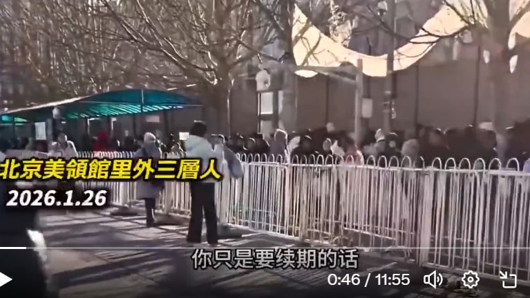 Theo hình ảnh trong video, ngày 26/1, bên ngoài Đại sứ quán Mỹ tại Bắc Kinh là hàng người xếp hàng dài, “ba lớp người trong ngoài”. Cùng ngày, trước Lãnh sự quán Mỹ ở Quảng Châu cũng là cảnh xếp hàng dài dằng dặc.