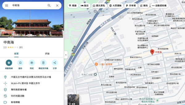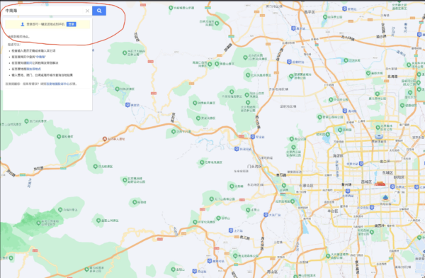 Trên phiên bản quốc tế của Google, dù có thể tìm “Zhongnanhai” hoặc “中南海”, nhưng kết quả tìm kiếm lại bị dẫn đến Thông Châu, Bắc Kinh.