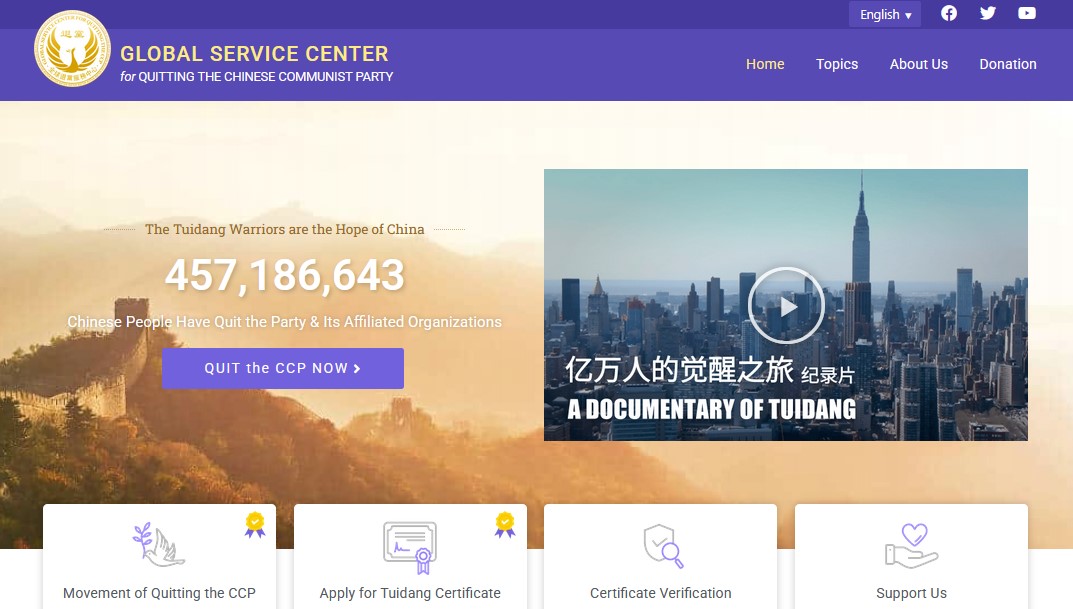 Trang tuidang.org thuộc về tổ chức “Trung tâm dịch vụ quốc tế dành cho việc thoái Đảng” (Global Service Center for Quitting Chinese Communist Party, Inc. a 501(c)(3)). Việc tổ chức này cung cấp “Giấy chứng nhận Thoái Đảng” phù hợp với luật pháp Hoa Kỳ cũng là điều tồn tại trong nhiều năm qua. Việc giấy chứng nhận là hợp pháp cũng có nghĩa là Đảng viên ĐCSTQ có thể thoái đảng để không bị ảnh hưởng bởi chế tài của Hoa Kỳ.