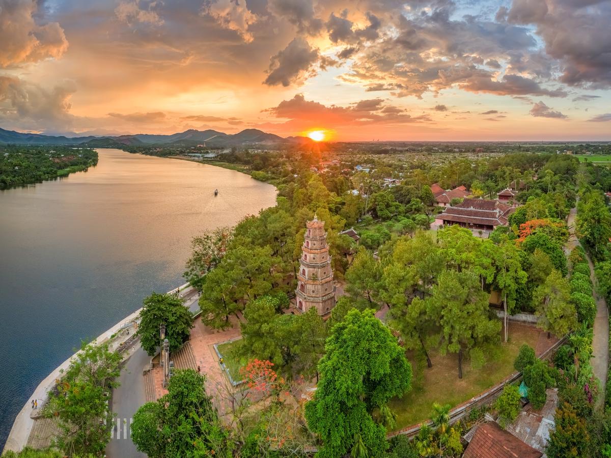 “chùa Thiên Mụ: nơi hội tụ tinh hoa của núi sông linh sảng, (thế đất như) rồng cuộn quay đầu xa chầu kinh đô, như hổ cao ngồi gầm cúi nhìn dòng Hương”.