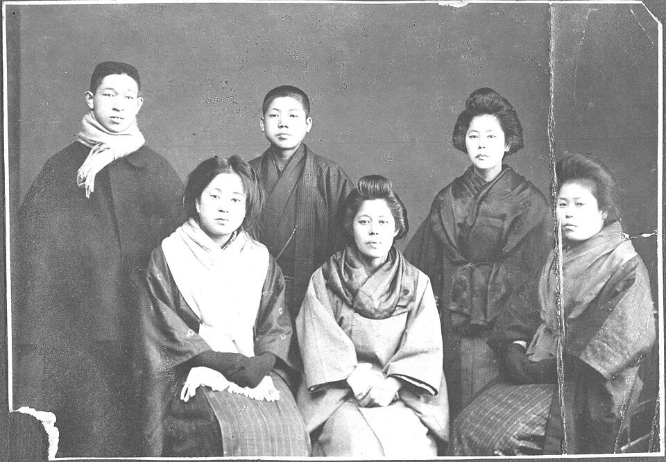 Các thành viên của Xưởng Sản Xuất Đồ Gia Dụng Điện Matsushita. Từ trái sang phải ở hàng phía sau là Kōnosuke Matsushita, Toshio Iue, Mumeno Matsushita. Toshio Iue là em trai của Mumeo, sau này noi gương anh rể đã sáng lập ra hãng Sanyo nổi tiếng. (Ảnh: Matsushita Electric Housewares Manufacturing Works, Public Domain)