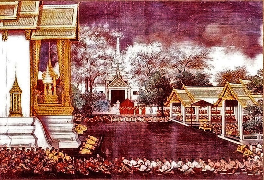 Đại thành (Ayutthaya) là vương quốc tín ngưỡng Phật giáo. Lúc này trong triều có Tể tướng Phraya Chakri là người kính ngưỡng Phật Pháp, có tiếng là từ bi và rất yêu quý trẻ con. Nghe tin có gia đình bỏ trẻ em ngoài cửa không nuôi, Tể tướng đến tìm hiểu và nói rằng điềm này là báo đứa trẻ này có số lớn, vì rồng rắn thường liên quan đến vĩ nhân như đế vương. Rồi ông động viên người cha nên nuôi đứa trẻ, nhưng người cha vẫn giữ ý không dám nuôi.